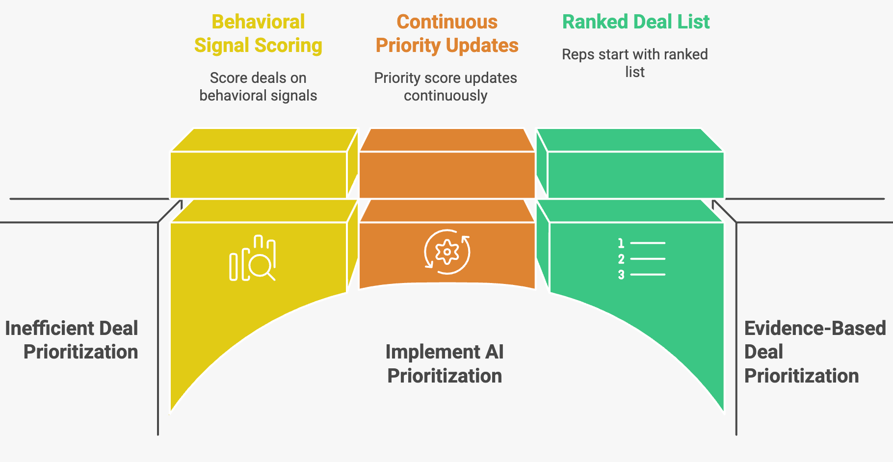 AI agents flip this model by scoring deals on behavioral signals, not just static CRM fields. Activity recency, stakeholder engagement depth, stage velocity, and buying-committee coverage all feed into a composite priority score that updates continuously.