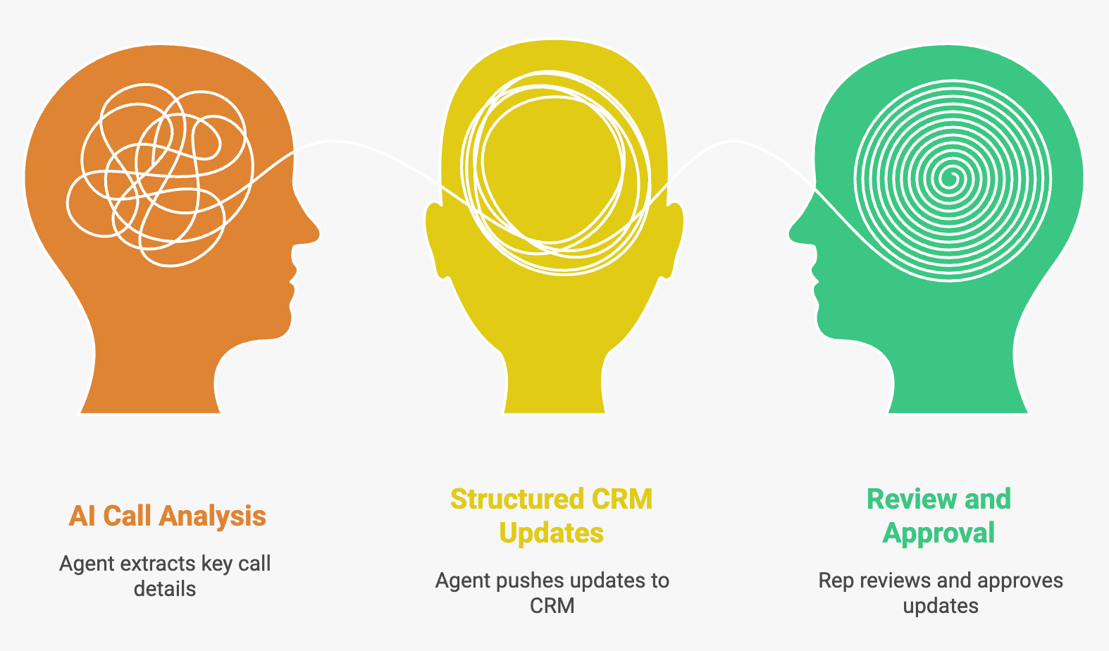 The agent-powered fix: An AI agent can listen to your call recordings, extract the relevant details (next steps, objections raised, stakeholder mentions, timeline updates), and push structured updates to your CRM fields automatically. The agent doesn't just transcribe. It understands your deal context, knows which fields matter, and logs the right information in the right place. You review and approve instead of doing the data entry yourself.
