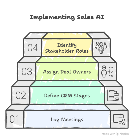 During the first 30 days, focus on quick wins. Standardize stage names, make sure every deal has an owner, and confirm that meetings are logged consistently. These small changes instantly improve AI’s visibility into your pipeline.