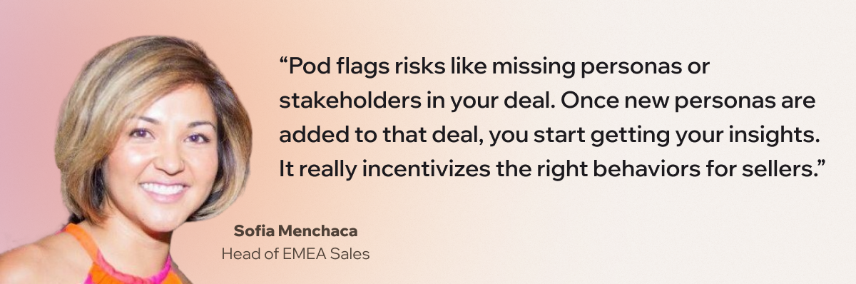 “Pod does a really cool thing where it flags risks like missing personas or stakeholders in your deal. And then once they are added to that opportunity, you start getting your insights. It really incentivizes the right behaviors in terms of CRM hygiene, which I, as well as many other sales professionals, find challenging.”