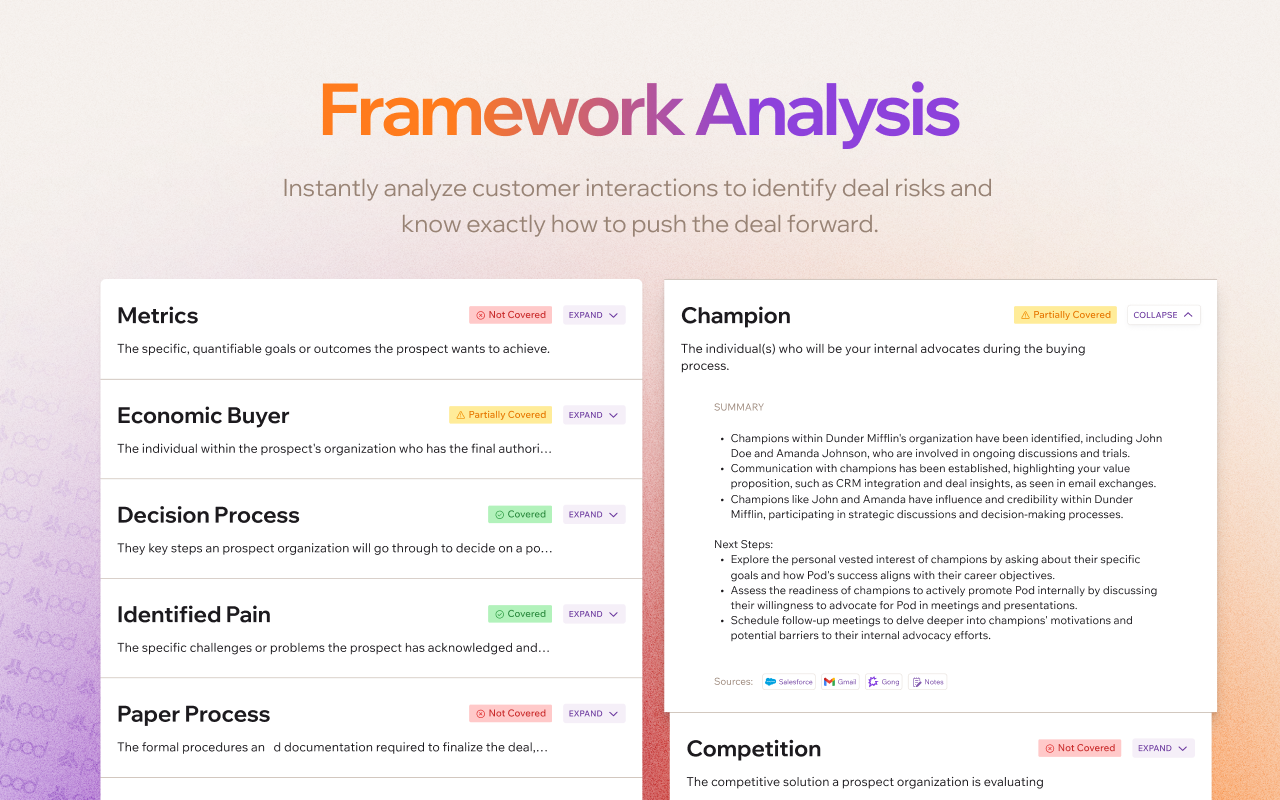 Every seller has been there. Scrambling to re-read all prospect notes, and checking the contact, company, and deal-level in case they’re missing anything critical before hopping into a call. But Pod’s framework analysis scans all touchpoints and provides a detailed summary for teams like Rachael’s in seconds. Sellers know which parts of their framework they’ve hit, which they’ve missed, and exactly what to cover in the meeting.