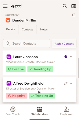 Deal Coach is your powerful at-a-glance view that synthesizes Pod data into one comprehensive dashboard. It’s your Account 360˚ home page that identifies risks, makes recommendations, and helps reps better guide deals to the finish line.